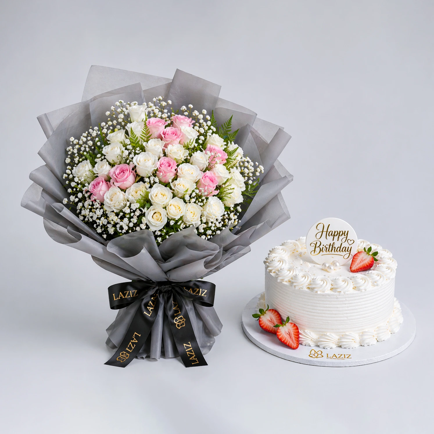 White Baby Rose 5, Pink baby Rose 3, Strawberry Flavor Cake 4-6 Person Serve