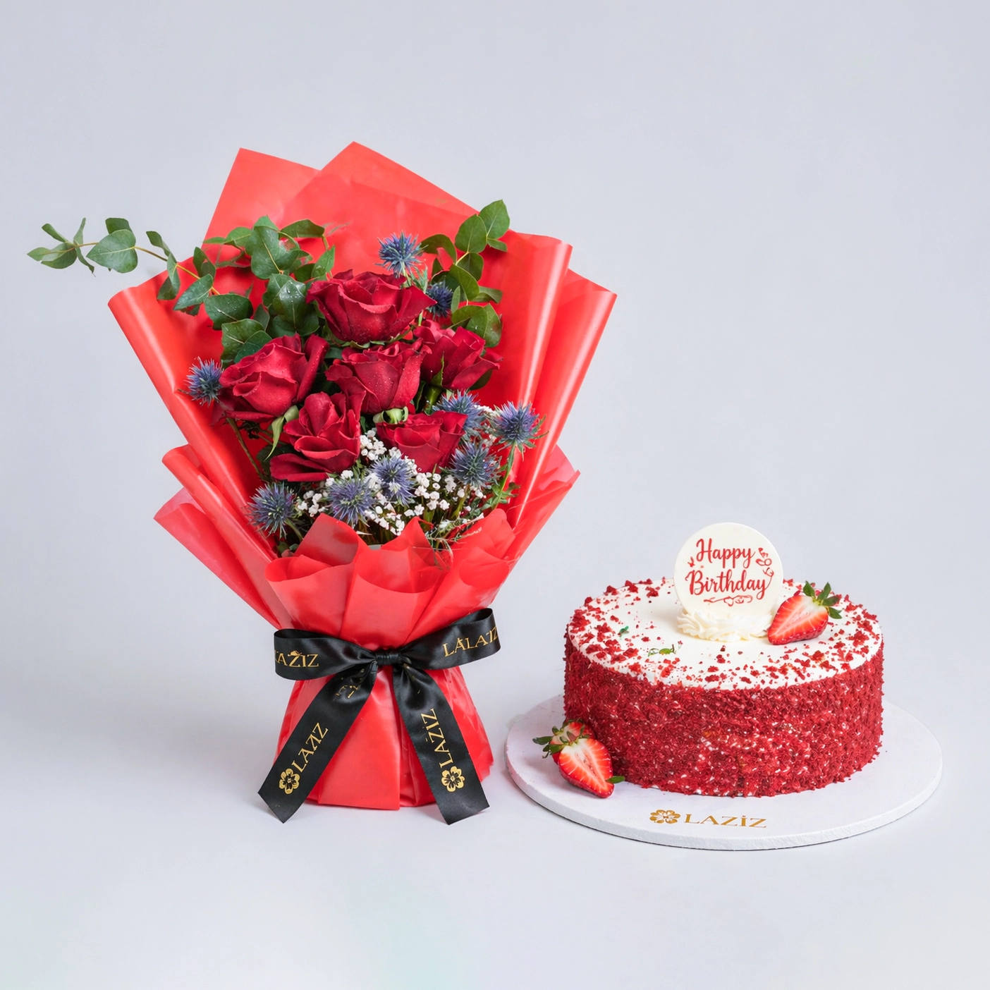 Red Rose 5,Eringium 2, Gypsum 1, Eucalyptus 2,Red Velvet Flavor Cake 4-6 Person Serve