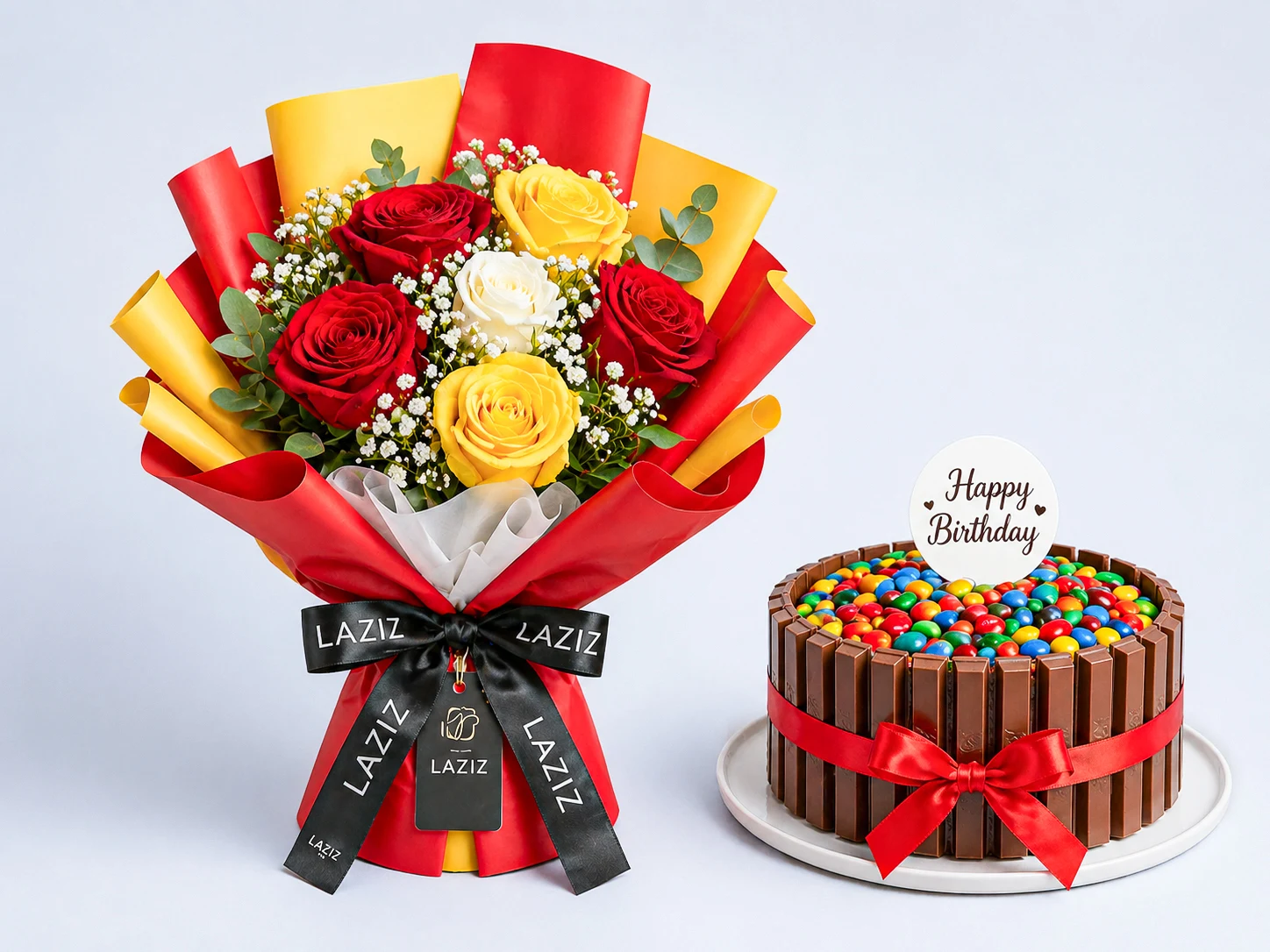 Red Rose 3, White Rose 1, Yellow Rose 2,Gypsum 1, Eucalyptus 1,Kitkat Cake 4-6 Person Serve