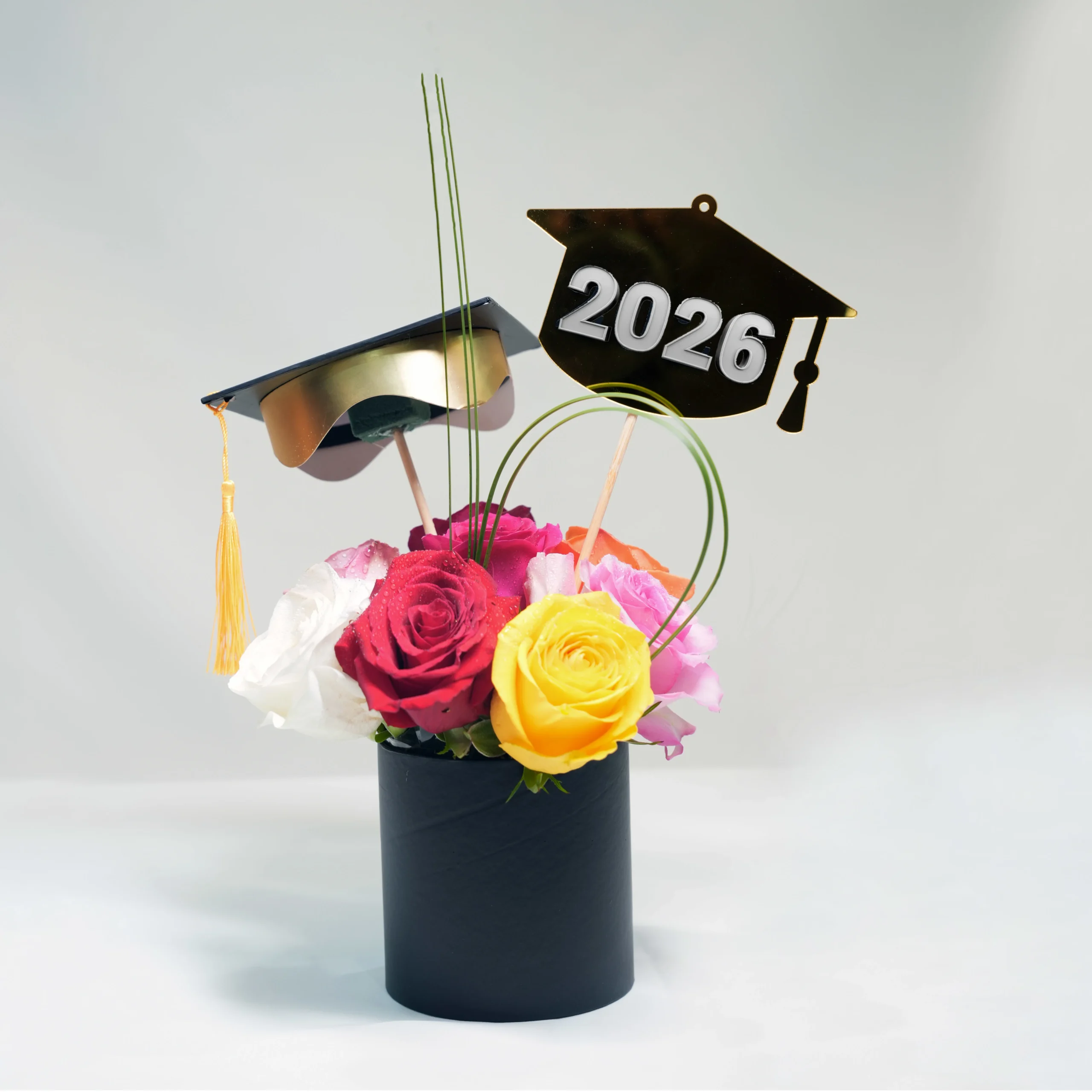 White Rose 1, Yellow Rose 1, Red Rose 2, Orange Rose 1, Pink Rose 2, Fushia Pink 1, Graduation Stick 1, Fancy Box