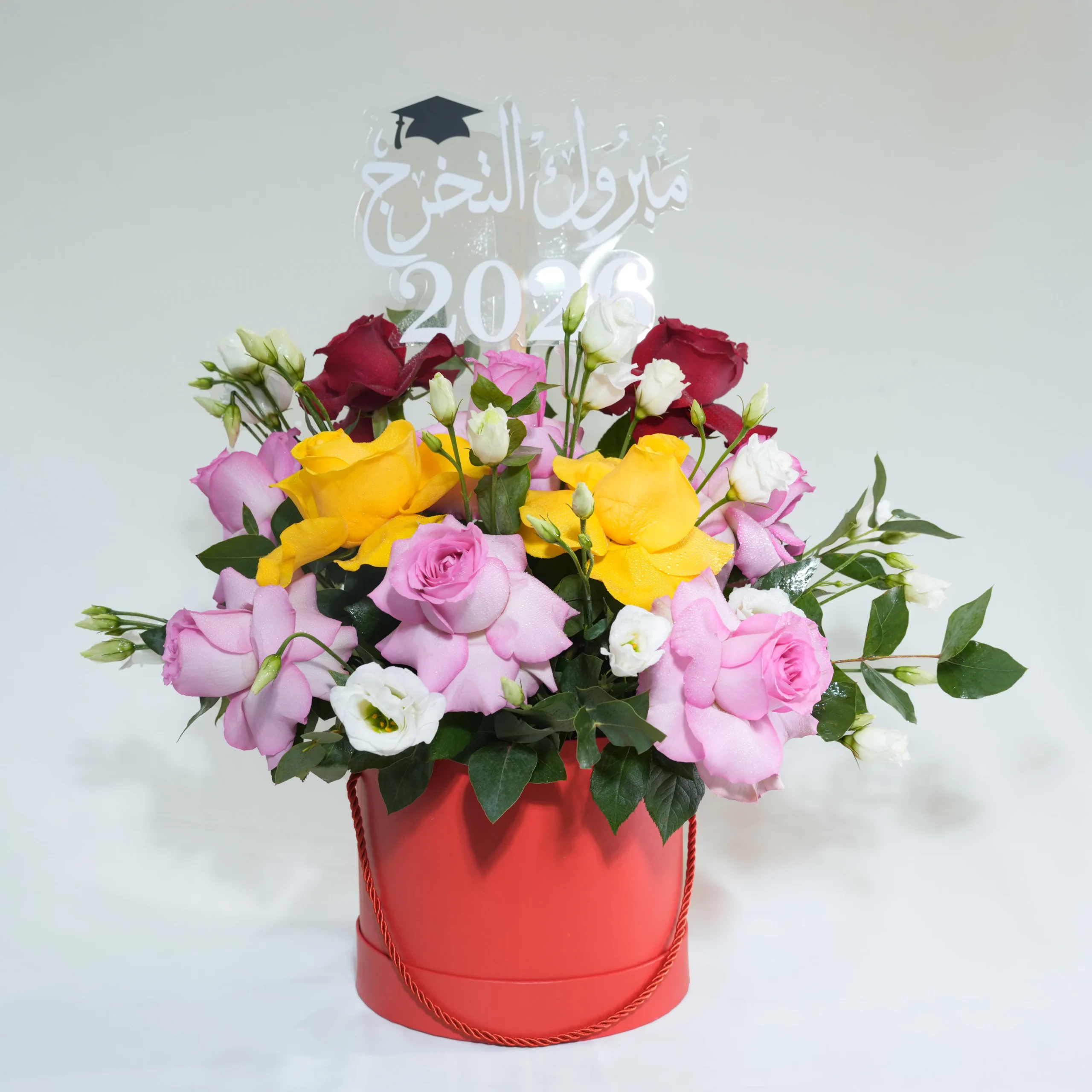 Pink Rose 6, Yellow Rose 2, Red Rose 2, Estoma White 4, Graduation Stick 1, Fancy Box
