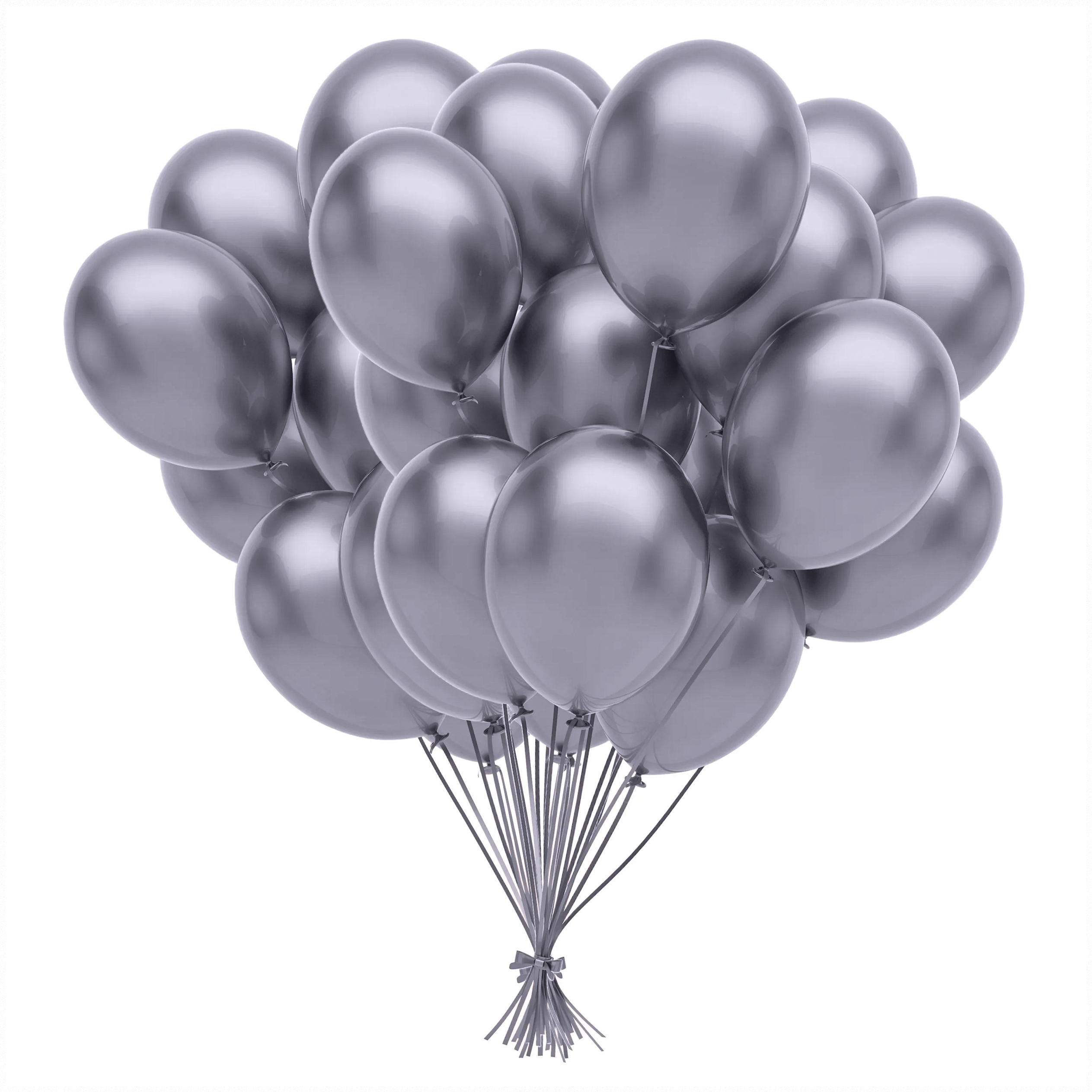 Set of 10 silver helium-filled balloons perfect for celebrations and special occasions. Lightweight and ready to float with vibrant metallic shine.