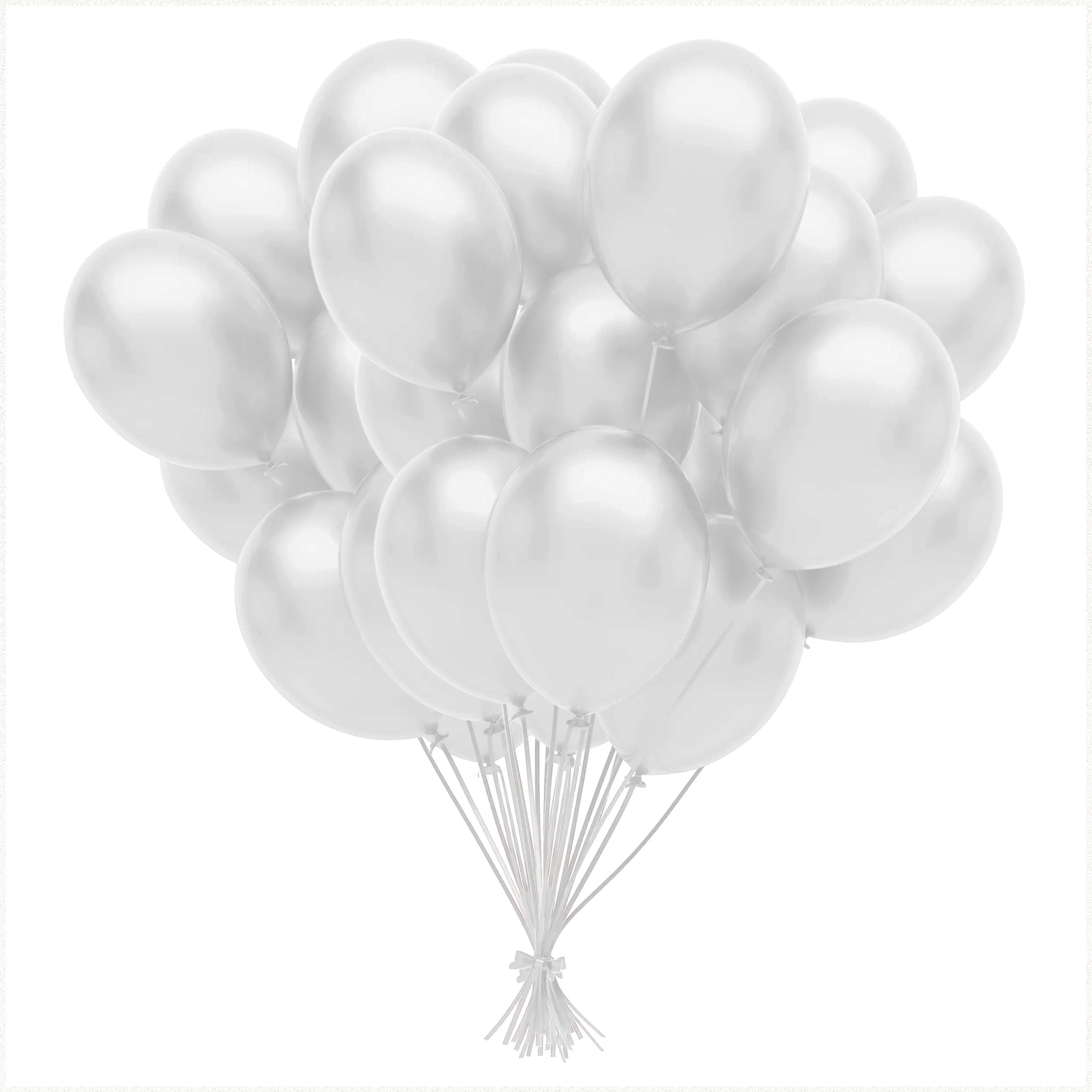 Set of 10 white helium-filled balloons perfect for celebrations and special occasions. Vibrant and long-lasting for decorative displays.